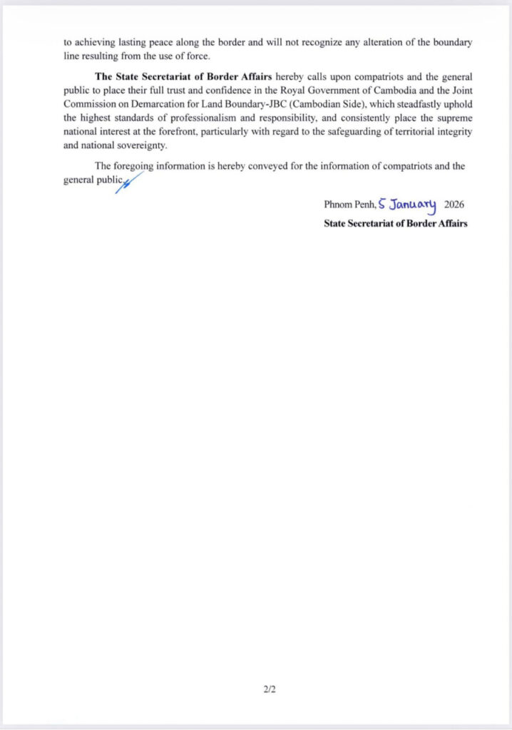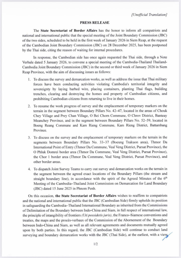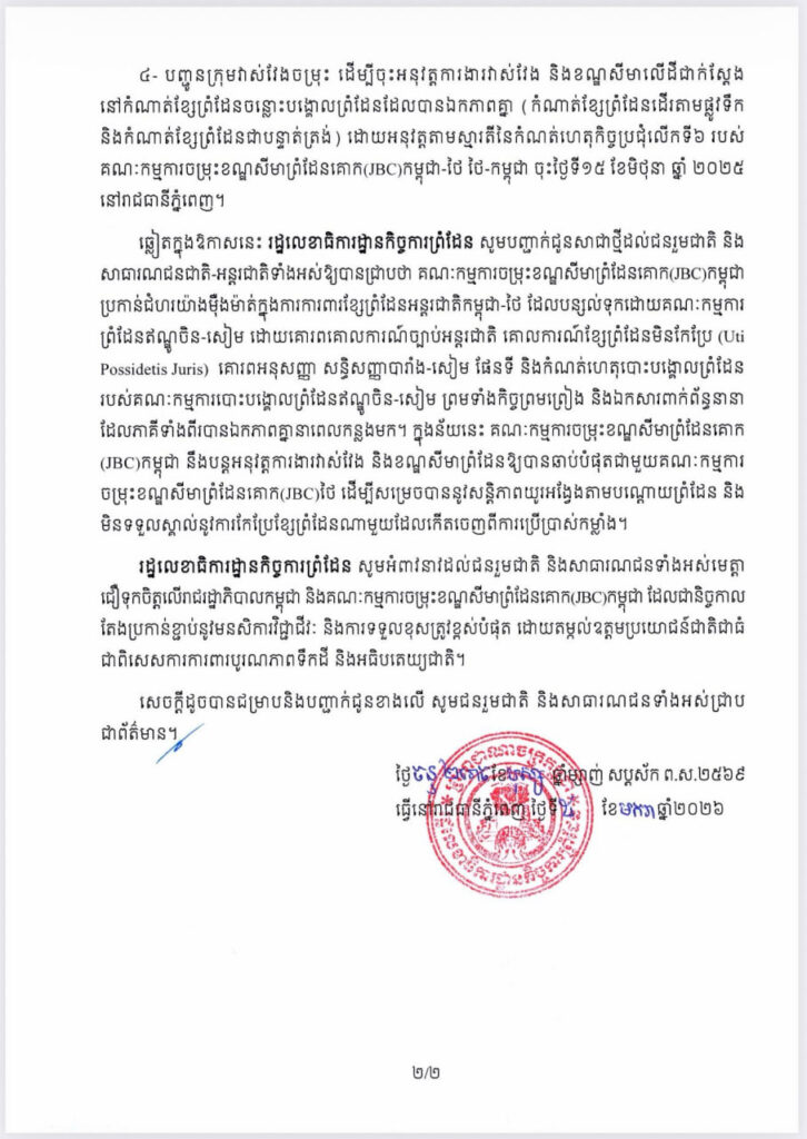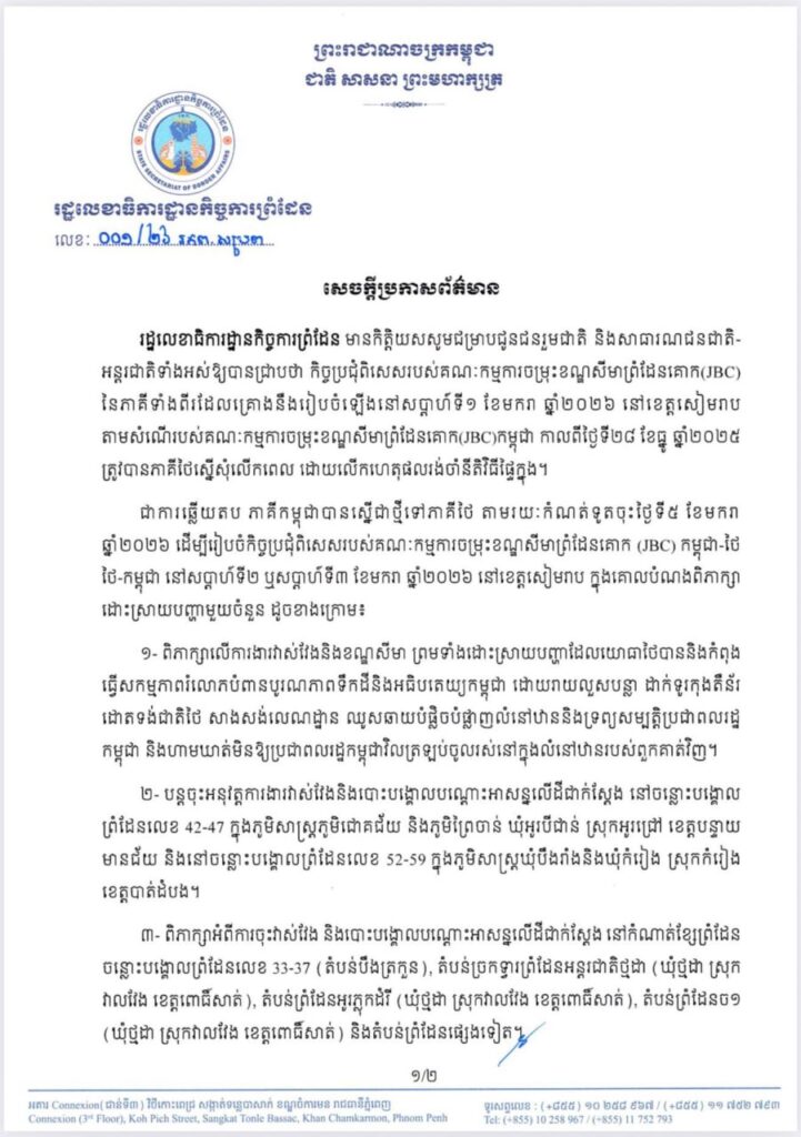 Uncategorized សេចក្ដីប្រកាសព័ត៌មាន របស់រដ្ឋលេខាធិការដ្ឋានកិច្ចការព្រំដែន ស្ដីពី កិច្ចប្រជុំពិសេសរបស់គណៈកម្មការចម្រុះខណ្ឌសីមា ព្រំដែនគោក (JBC) នៃភាគីទាំងពីរដែលគ្រោងនឹងរៀបចំឡើង នៅសប្តាហ៍ទី១ ខែមករា ឆ្នាំ២០២៦ នៅខេត្តសៀមរាប តាមសំណើរបស់គណៈកម្មការចម្រុះខណ្ឌសីមាព្រំដែនគោក(JBC)កម្ពុជា កាលពីថ្ងៃទី២៨ ខែធ្នូ ឆ្នាំ២០២៥ ត្រូវបានភាគីថៃ ស្នើសុំលើកពេល ដោយលើកហេតុផលរង់ចាំនីតិវិធីផ្ទៃក្នុង។ bently tvnews January 5, 2026 ចំនួនអ្នកទស្សនា: 👁 3 Continue Reading Previous: អបអរសាទរបងប្អូនកម្មករនិយោជិត ផ្នែកវាយនភណ្ឌ កាត់ដេរ ផលិតស្បែកជើង និងផលិតផលិតផលធ្វើដំណើរ និងកាបូប ចាប់ផ្ដើមទទួលប្រាក់ឈ្នួលអប្បបរមា ២១០$ ចាប់ពីខែនេះតទៅ ។Next: សម្តេចអគ្គមហាសេនាបតីតេជោ ហ៊ុន សែន ប្រធានព្រឹទ្ធសភានៃព្រះរាជាណាចក្រកម្ពុជា អនុញ្ញាតឱ្យ ឯកឧត្តម Mohammed Ismaeil A. Dahlwy ឯកអគ្គរាជទូតវិសាមញ្ញ និងពេញសមត្ថភាព នៃព្រះរាជាណាចក្រអារ៉ាប៊ីសាអូឌីត ប្រចាំនៅកម្ពុជា ចូលជួបសម្ដែងការគួរសម និងជម្រាបលា នៅវិមានព្រឹទ្ធសភា រាជធានីភ្នំពេញ។ Leave a Reply Cancel replyYour email address will not be published. Required fields are marked *Comment * Name * Email * Website Save my name, email, and website in this browser for the next time I comment. Related Stories Uncategorized សម្តេចធិបតី ហ៊ុន ម៉ាណែត៖ ៧ មករា គឺជាថ្ងៃនៃការចងចាំនូវមហាវីរភាព ដឹងគុណការតស៊ូរបស់យុវជនជំនាន់មុនបន្សល់ទុកមរតកនៃជីវិតប្រជាជនខ្មែរ bently tvnews January 8, 2026 Uncategorized សម្តេចតេជោ ហ៊ុន សែន អញ្ជើញពិនិត្យវឌ្ឍនភាពនៃការសាងសង់អាគារវិមានព្រឹទ្ធសភាថ្មី bently tvnews January 7, 2026 Uncategorized សេចក្តីប្រកាសព័ត៌មាន bently tvnews January 6, 2026